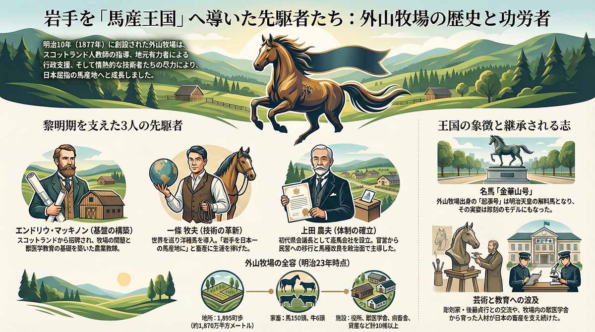 岩手の畜産史を語るうえで、決して欠かすことのできない舞台があります。それが「外山牧場」です。しかし、その歴史を真に輝かせたのは、厳しい自然に挑み、牛馬と共に生きた「人」たちの情熱でした。