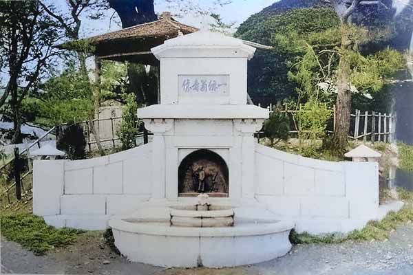 昭和十三年(一九三八)十月十九日に、八十一歳で亡くなりました。死ぬ前に、その功績を顕彰するため、吉川保正氏の作った翁の小さな銅像が中の橋ぎわに建てられました。中の橋の西側の今小さな築山のあるところに、みかげ石で築いた馬の水飲場をつくって、水飲場の向こう岸のところに翁が馬を曳いて撫でているという小像でしたが、戦時中に回収されて持っていかれてしまいました。